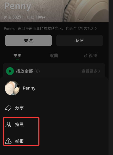 - 选择拉黑:弹出菜单,点“拉黑账户”或“屏蔽歌手”。